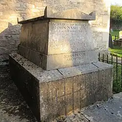 On 28 March 1835 Nash was described as "very poorly and faint".[108] This was the beginning of the end. On 1 May Nash's solicitor John Wittet Lyon was summonsed to East Cowes Castle[108] to finalise his will. By 6 May he was described as "very ill indeed all day",[109] he died at his home on 13 May 1835. His funeral took place at St. James's Church, East Cowes on 20 May, where he was buried in the churchyard with a monument in the form of a stone sarcophagus.[110] His widow acted to clear Nash's debts (some £15,000; £1.97 million in 2020 money),[110] she held a sale of the Castle's contents, including three paintings by J. M. W. Turner painted on the Isle of Wight, four by Benjamin West and several copies of old master paintings by Richard Evans. These artworks were sold at Christie's on 11 July 1835 for £1,061 (~£139,500 in 2020 money).[110] His books, medals, drawings and engravings were bought by a bookseller named Evans for £1,423 on 15 July (~£187,078 in 2020 money). The Castle itself was sold for a reported figure of £20,000 (~£2.63 million in 2020 money) to Henry Boyle, 3rd Earl of Shannon, within the year.[110] Nash's widow retired to a property Nash had bequeathed to her in Hampstead where she lived until her death in 1851; she was buried with her husband on the Isle of Wight.[111]