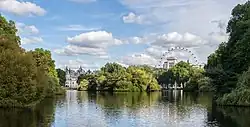 Nash went on to re-landscape St. James's Park (1814–1827),[62] reshaping the formal canal into the present lake, and giving the park its present form. A characteristic of Nash's plan for Regent Street was that it followed an irregular path linking Portland Place to the north with Carlton House, London (replaced by Nash's Carlton House Terrace (1827–1833),[63] to the south. At the northern end of Portland Place Nash designed Park Crescent, London (1812 and 1819–1821),[64] this opens into Nash's Park Square, London (1823–24),[65] this only has terraces on the east and west, the north opens into Regent's Park.