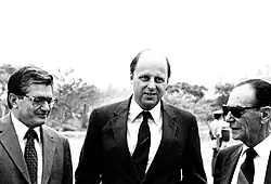 Negroponte joined the United States Foreign Service in 1960.[4] He served at eight different Foreign Service posts in Asia (including the U.S. Embassy, Saigon),[5] Europe and Latin America, and he also held important positions at the State Department and the White House. As a young Foreign Service officer—one of the few men in Washington who dared to openly disagree with Henry Kissinger's secretive handling of the Vietnam peace talks—Negroponte attempted to convince his superior that any peace agreement negotiated without the consent of South Vietnam's leader Nguyen Van Thieu would fail. Seymour Hersh claims in his book The Price of Power that Kissinger never forgave Negroponte, and, upon becoming Secretary of State, exiled him to Quito, Ecuador. This was to be the beginning of Negroponte's long distinguished career as an ambassador. In 1981, he became the U.S. Ambassador to Honduras. From 1985 to 1987, Negroponte held the position of Assistant Secretary of State for Oceans and International Environmental and Scientific Affairs. Subsequently, he served as Deputy Assistant to the President for National Security Affairs, from 1987 to 1989; Ambassador to Mexico, from 1989 to 1993; and Ambassador to the Philippines from 1993 to 1996. As Deputy National Security Advisor to President Ronald Reagan, he was involved in the campaign to remove General Manuel Noriega from power in Panama. From 1997 until his appointment as ambassador to the U.N., Negroponte was an executive with McGraw-Hill.[6]