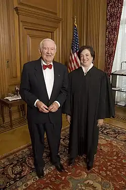 Born in Chicago, Stevens served in the United States Navy during World War II and graduated from Northwestern University School of Law. After clerking for Justice Wiley Rutledge, he co-founded a law firm in Chicago, focusing on antitrust law. In 1970, President Richard Nixon appointed Stevens to the United States Court of Appeals for the Seventh Circuit. Five years later, President Gerald Ford nominated Stevens to the Supreme Court to fill the vacancy caused by the retirement of Justice William O. Douglas. He became the senior associate justice after the retirement of Harry Blackmun in 1994. After the death of Chief Justice William Rehnquist in 2005, Stevens briefly served as acting Chief Justice before the appointment of John Roberts. Stevens retired in 2010 during the administration of President Barack Obama and was succeeded by Elena Kagan.[8]