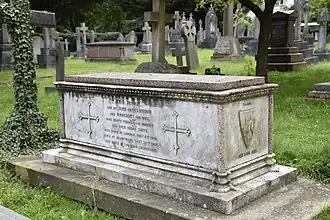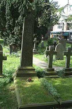 John James had hoped to practise law, and was articled as a clerk in London.[1] His father, John Thomas Ruskin, described as a grocer (but apparently an ambitious wholesale merchant), was an incompetent businessman. To save the family from bankruptcy, John James, whose prudence and success were in stark contrast to his father, took on all debts, settling the last of them in 1832.[1] John James and Margaret were engaged in 1809, but opposition to the union from John Thomas, and the problem of his debts, delayed the couple's wedding. They finally married, without celebration, in 1818.[3] John James died on 3 March 1864 and is buried in the churchyard of St John the Evangelist, Shirley, Croydon.
