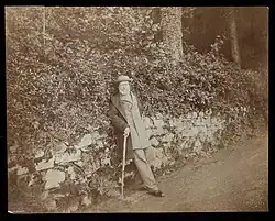 Although in 1877 Ruskin said that in 1860, "I gave up my art work and wrote Unto This Last… the central work of my life" the break was not so dramatic or final.[95] Following his crisis of faith, and urged to political and economic work by his professed "master" Thomas Carlyle, to whom he acknowledged that he "owed more than to any other living writer", Ruskin shifted his emphasis in the late 1850s from art towards social issues.[96][97][98] Nevertheless, he continued to lecture on and write about a wide range of subjects including art and, among many other matters, geology (in June 1863 he lectured on the Alps), art practice and judgement (The Cestus of Aglaia), botany and mythology (Proserpina and The Queen of the Air). He continued to draw and paint in watercolours, and to travel extensively across Europe with servants and friends. In 1868, his tour took him to Abbeville, and in the following year he was in Verona (studying tombs for the Arundel Society) and Venice (where he was joined by William Holman Hunt). Yet increasingly Ruskin concentrated his energies on fiercely attacking industrial capitalism, and the utilitarian theories of political economy underpinning it. He repudiated his sometimes grandiloquent style, writing now in plainer, simpler language, to communicate his message straightforwardly.[99]