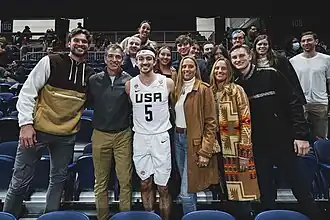 Houston Stockton played college football as a defensive back for the Montana Grizzlies.[80][81] In 2011, Michael Stockton, who played basketball at Salt Lake City's Westminster College,[80][82] signed with BG Karlsruhe in Germany's second basketball division.[83] In 2017, Michael signed with BG Göttingen in Germany's first basketball division, the Basketball Bundesliga.[84] David Stockton completed his college basketball career at Gonzaga in 2014 and, after playing for the Reno Bighorns in the NBA's Development League, played for the NBA's Sacramento Kings and Utah Jazz.[85] Daughter Lindsay Stockton played basketball for Montana State University[86] and daughter Laura Stockton played basketball at Gonzaga.[87]
