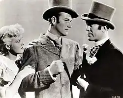 After the commercial failure of The Big Trail, Wayne was relegated to small roles in A pictures, including Columbia's The Deceiver (1931), in which he played a corpse. He appeared in the serial The Three Musketeers (1933), an updated version of the Alexandre Dumas novel in which the protagonists were soldiers in the French Foreign Legion in then-contemporary North Africa. He played the lead, with his name over the title, in many low-budget Poverty Row Westerns, mostly at Monogram Pictures and serials for Mascot Pictures Corporation. By Wayne's own estimation, he appeared in about 80 of these horse operas from 1930 to 1939.[36] In Riders of Destiny (1933), he became one of the first singing cowboys of film, albeit via dubbing.[37] Wayne also appeared in some of the Three Mesquiteers Westerns, whose title was a play on the Dumas classic. He was mentored by stuntmen in riding and other Western skills.[31] Stuntman Yakima Canutt and Wayne developed and perfected stunts and onscreen fisticuffs techniques that are still in use.[38] One of the main innovations with which Wayne is credited in these early Poverty Row Westerns is allowing the good guys to fight as convincingly as the bad guys, by not always making them fight clean. Wayne claimed, "Before I came along, it was standard practice that the hero must always fight clean. The heavy was allowed to hit the hero in the head with a chair or throw a kerosene lamp at him or kick him in the stomach, but the hero could only knock the villain down politely and then wait until he rose. I changed all that. I threw chairs and lamps. I fought hard and I fought dirty. I fought to win."[39]