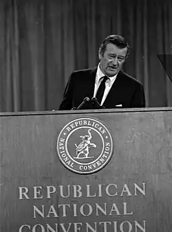 Wayne supported Vice President Richard Nixon in the presidential election of 1960, but expressed his vision of patriotism when John F. Kennedy won the election: "I didn't vote for him, but he's my president, and I hope he does a good job."[121] He used his star power to support conservative causes, including rallying support for the Vietnam War by producing, co-directing, and starring in the financially successful film The Green Berets (1968).[122] In 1960, he joined the anti-communist John Birch Society, but quit after the organization denounced fluoridation of water supplies as a communist plot.[123] In 1964, Wayne was a staunch supporter of Barry Goldwater, and actively campaigned for him.[124]