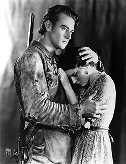 As a favor to coach Jones, who had given silent Western film star Tom Mix tickets to USC games, director John Ford and Mix hired Wayne as a prop boy and extra.[29][30] Wayne later credited his walk, talk, and persona to his acquaintance with Wyatt Earp, who was good friends with Mix.[29] Wayne soon moved to bit parts, establishing a longtime friendship with Ford, the director who provided most of those roles. Early in this period, he had a minor, uncredited role as a guard in the 1926 film Bardelys the Magnificent. Wayne also appeared with his USC teammates playing football in Brown of Harvard (1926), The Dropkick (1927), and Salute (1929) and Columbia's Maker of Men (filmed in 1930, released in 1931).[31] While working for Fox Film Corporation in bit roles, Wayne was given on-screen credit as "Duke Morrison" only once, in Words and Music (1929). Director Raoul Walsh saw him moving studio furniture while working as a prop boy and cast him in his first starring role in The Big Trail (1930). For his screen name, Walsh suggested "Anthony Wayne", after Revolutionary War General "Mad" Anthony Wayne. Fox Studios chief Winfield Sheehan rejected it as sounding "too Italian". Walsh then suggested "John Wayne". Sheehan agreed, and the name was set. Wayne was not even present for the discussion.[32] His pay was raised to $105 a week.[33]
