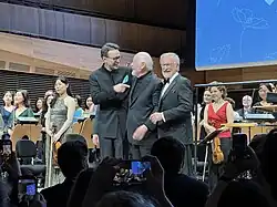 Williams conducted the Berlin Philharmonic from October 14–16, 2021, marking his second engagement with a European orchestra and his first with the Berlin Philharmonic.[131] In 2022, in celebration of his 90th birthday, Williams conducted the Vienna Philharmonic in March, and was honored on August 20 with a tribute at Tanglewood.[132] The tribute at Tanglewood featured James Taylor, Yo-Yo Ma, and Branford Marsalis. The Boston Symphony Orchestra performed some of Williams' best-known music, with Williams conducting the "Raiders March" from the Indiana Jones movies at the end of the show.[133] Williams made a surprise appearance at the U.S. premiere of the Indiana Jones and the Dial of Destiny (2023) on June 15, where he conducted themes with a live symphony orchestra. Also present were Spielberg, Lucas, Harrison Ford, and James Mangold.[134] Later that year, he conducted the Saito Kinen Orchestra in Matsumoto and Tokyo, Japan, marking his return to the country for the first time in over thirty years.[135]