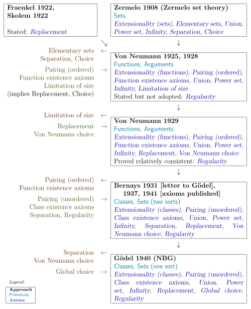 At the beginning of the 20th century, efforts to base mathematics on naive set theory suffered a setback due to Russell's paradox (on the set of all sets that do not belong to themselves).[88] The problem of an adequate axiomatization of set theory was resolved implicitly about twenty years later by Ernst Zermelo and Abraham Fraenkel. Zermelo–Fraenkel set theory provided a series of principles that allowed for the construction of the sets used in the everyday practice of mathematics, but did not explicitly exclude the possibility of the existence of a set that belongs to itself. In his 1925 doctoral thesis, von Neumann demonstrated two techniques to exclude such sets—the axiom of foundation and the notion of class.[89]