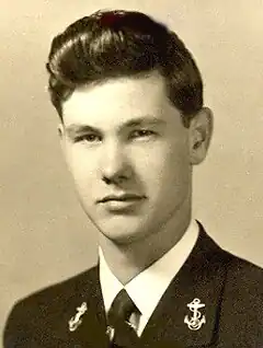 Carson joined the United States Navy on June 8, 1943, and received V-12 Navy College Training Program officer training at Columbia University[8] and Millsaps College.[9] Commissioned an ensign late in the war, Carson was assigned to the USS Pennsylvania in the Pacific. He arrived on the Pennsylvania on August 14, 1945, the same day Imperial Japan announced its surrender. The ship was sent to Guam after a torpedo bomber attack damaged its stern prior to Carson's arrival. Once in drydock, Carson, assigned to damage control, was given the task of supervising the removal of the bodies of 20 servicemen and their effects. He recounted the experience in an unpublished 1967 Time magazine interview, stating "Jesus, that was an awful experience. They'd been down there for eighteen days by the time, and I want to tell you, that was a terrible job." Carson returned stateside with the Pennsylvania to Seattle and was then assigned to command a troop train for returning servicemen. He finished his service in Guam, decoding encrypted messages.[10]