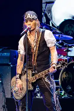 In 2015, Depp formed the supergroup Hollywood Vampires with Alice Cooper and Joe Perry; the band also includes Bruce Witkin, his friend from his 1980s band, The Kids. Hollywood Vampires released their self-titled debut studio album in September 2015. It featured eleven classic rock covers, as well as three original songs (all co-written by Depp).[236] The band made their live debut at The Roxy in Los Angeles in September 2015,[237] and has since done three world tours in 2016,[238] 2018[239][240] and 2023.[241][242] Their second studio album, Rise, was released in June 2019 and consists mostly of original material, including songs written by Depp. The album also features a cover version of David Bowie's "Heroes", sung by Depp.[243]