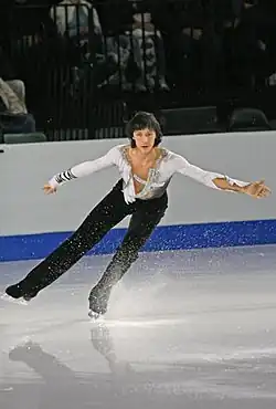 Weir's short program this season was based upon an interpretation of Camille Saint-Saëns' The Swan, which was traditionally danced and skated to by women. Tarasova had been pushing to create a short program for Weir with Saint-Saëns' music since the two began working together, believing that his "naturally quiet and delicate way on the ice mirrored the mellow cello piece". Although Weir was hesitant at first, he agreed to introduce the program during the 2006 Olympic season.[77] The New York Times reported on the costume and music he chose for his short program, "a black-and-white costume that sparkled under the lights, and one red glove symbolizing the beak of a swan".[78] He debuted the program, choreographed by Tarasova, Shanetta Folle, and Evgeni Platov, during a practice session at Skate Canada.[78][79] He later reported that the initial reaction to it was laughter and that he told reporters, when they asked about the red glove, that he had named it "Camille", in honor of the piece's composer.[80] Weir was aware of the impact it would make on the public and in the figure skating world, and that it could harm his reputation with the judges;[81] he later stated, "Gender bending would take me into a whole new and very taboo area, where I would stand totally alone".[77] He also stated that although people were initially uncomfortable with the program, it would become one of his most popular programs and would "completely change the world's perception of me".[82] His performance and swan costume were parodied in the 2007 comedy Blades of Glory, starring Jon Heder and Will Ferrell.[17][83]