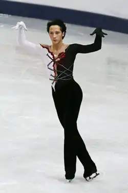 Weir won the NHK Trophy,[25] his first Grand Prix title and the first time he competed under the ISU Judging System (IJS). He earned 146.20 points in the free skate and 220.25 points overall, beating his runner-up Timothy Goebel by over 20 points.[58][59] Weir's trip to Japan marked the first time he came "face-to-face"[60] with Johnny's Angels, a group of figure skating fans who supported Weir emotionally and financially.[61] He also won Trophee Bompard[25] with a score of 208.10 points, despite coming in second in the free skate, behind French skater and European champion Brian Joubert, who came in second place overall.[62] Weir "skated elegantly"[62] in his free skate, but doubled his three planned triples in the second half of his program, which hurt his technical scores.[62] He again did not include any quadruple jumps, choosing instead to emphasize his artistry, spins, and pirouettes.[63] Weir later said that his win in Paris "signaled my ascendancy on the international stage".[64]