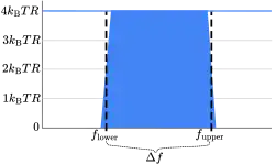 Figure 3. While thermal noise has an almost constant power spectral density of , a band-pass filter with bandwidth passes only the shaded area of height and width . Note: practical filters don't have brickwall cutoffs, so the left and right edges of this area are not perfectly vertical.