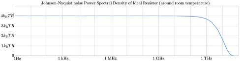 Figure 2. Johnson–Nyquist noise has a nearly a constant 4kBTR power spectral density per unit of frequency, but does decay to zero due to quantum effects at high frequencies (terahertz for room temperature). This plot's horizontal axis uses a log scale such that every vertical line corresponds to a power of ten of frequency.