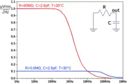 Ideal capacitors, as lossless devices, do not have thermal noise. However, the combination of a resistor and a capacitor (an RC circuit, a common low-pass filter) has what is called kTC noise. The equivalent noise bandwidth of an RC circuit is [7] When this is substituted into the thermal noise equation, the result has an unusually simple form as the value of the resistance (R) drops out of the equation. This is because higher R decreases the bandwidth as much as it increases the spectral density of the noise in the passband.
