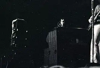 Lord absorbed the blues sounds that played a key part in his rock career, principally the raw sounds of the great American jazz and blues organists, such as Wild Bill Davis, Jimmy Smith, Jimmy McGriff and "Brother" Jack McDuff ("Rock Candy"), as well as the stage showmanship of Jerry Lee Lewis and performers like Buddy Holly, whom he saw perform at the De Montfort Hall in Leicester in March 1958.[6] The jazz-blues organ style of black R&B organ players in the 1950s and 1960s, using the trademark blues-organ sound of the Hammond organ (B3 and C3 models) and combining it with the Leslie speaker system (the well-known Hammond-Leslie speaker combination), were seminal influences on Lord. Lord also stated that he was heavily influenced by the organ-based progressive rock played by Vanilla Fudge after seeing that band perform in Great Britain in 1967, and earlier by the personal direction he received from British organ pioneer Graham Bond.[7]