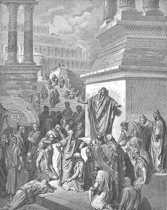 God again commands Jonah to travel to Nineveh and prophesy to its inhabitants.[21] This time he travels there and enters the city, crying, "In forty days Nineveh shall be overthrown."[22] After Jonah has walked across Nineveh, the people begin to believe his word and proclaim a fast.[23] The king of Nineveh puts on sackcloth and sits in ashes, making a proclamation which decrees fasting, the wearing of sackcloth, prayer and repentance.[24] God sees their repentant hearts and spares the city at that time.[25] The entire city is humbled and broken, with the people (and even the livestock)[26][27] wearing sackcloth and ashes.[28]