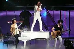 The Jonas Brothers' third studio album, A Little Bit Longer, was released in the United States on August 12, 2008. On June 24, 2008, iTunes announced that it would release four songs from A Little Bit Longer, one roughly every two weeks.[32] The purchase of each of the songs applies to the cost of the entire album, which could be purchased via iTunes' Complete the Album feature after release. Each song released also featured a podcast. Each song occupied the number one spot on iTunes for at least three days. After the Look Me in the Eyes Tour ended on March 22, 2008, the Jonas Brothers announced that they would be opening up for Avril Lavigne's The Best Damn Tour along with Boys Like Girls, for the second leg of the tour in Europe, which lasted from late May to late June 2008.[33] While filming Camp Rock, the Jonas Brothers co-wrote and co-produced six songs for fellow Disney Channel star Demi Lovato, for Lovato's album Don't Forget.[34] The album, co-produced by the Jonas Brothers, was released on September 23, 2008.[35] A soundtrack was released for Camp Rock on June 17, 2008, debuting at No. 3 on the Billboard 200 with 188,000 copies sold in its first week.[36] The Jonas Brothers also did a half-hour variety special on Disney Channel entitled, Studio DC: Almost Live, that featured The Muppets and other Disney Channel stars. During this time, the Jonas Brothers also appeared on the Olympics-based special miniseries the Disney Channel Games, for the third annual show.[37]