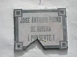 The postwar cult of personality had two ubiquitous icons. The first, a funereal slab placed on the external wall of many churches and cathedrals which bore the crowning inscription, Caídos por Dios y por España ("Fallen for God and for Spain"), followed by a list of local Nationalists killed during the war; Primo de Rivera's name headed every list.[42] The second was the rallying cry, "José Antonio—¡Presente!," a figurative reply to an imaginary roll call invoking his ghostly attendance or immanence.