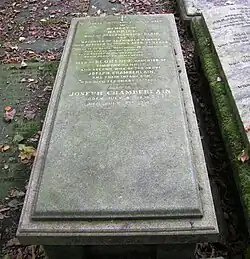 Chamberlain and Florence had four children: the future Prime Minister Neville in 1869, Ida in 1870, Hilda in 1871 and Ethel in 1873. The teaching of these four children was taken on by their elder half sister, Beatrice, who was destined to make her mark as an educationalist.[17] On 13 February 1875 Florence gave birth to their fifth child, but she and the child died within a day.[17] Though a Unitarian during his lifetime, the experiences Chamberlain endured with losing both wives in childbirth resulted in him losing personal faith, rejecting religious creeds and not requiring religious adherence of any of his children.[19]
