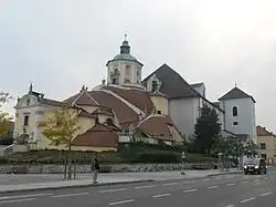 On 26 May Haydn played his "Emperor's Hymn" with unusual gusto three times; the same evening he collapsed and was taken to what proved to be his deathbed.[55] He died peacefully in his own home at 12:40 a.m. on 31 May 1809, aged 77.[56] On 15 June, a memorial service was held in the Schottenkirche at which Mozart's Requiem was performed. Haydn's remains were interred in the local Hundsturm cemetery until 1820 when they were moved to Eisenstadt by Prince Nikolaus. His head took a different journey; it was stolen by phrenologists shortly after burial, and the skull was reunited with the other remains only in 1954, now interred in a tomb in the north tower of the Bergkirche.
