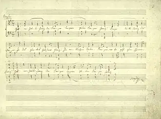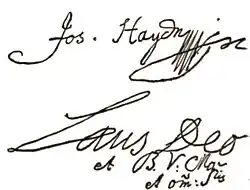 Haydn was a devout Catholic who often turned to his rosary when he had trouble composing, a practice that he usually found to be effective.[60] He normally began the manuscript of each composition with In nomine Domini [in the name of the Lord] and ended with Laus Deo [praise be to God].[61] He retained this practice even in his secular works; he frequently only uses the initials "L. D.", "S. D. G." [soli Deo gloria], or Laus Deo et B. V. M. [... and to Beatae Virgini Mariae] and sometimes adds, "et oms sis" (et omnibus sanctis – and all saints)[62]