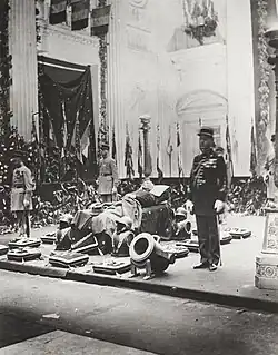 On 13 June Pershing, who had landed at Boulogne that morning, met Joffre, Paul Painlevé (war minister), Viviani and Foch (chief of staff) in Paris.[79] Joffre recommended that an American unit be rushed to France to show the flag. 2nd Battalion, 16th Infantry Regiment was sent, and was reviewed by Joffre and President Poincaré as it marched up the Champs-Élysées on 4 July.[80] Pershing rejected Painlevé's suggestion that Joffre head the liaison group of French officers who were helping to set up his supply lines; Pershing insisted on using the Atlantic ports of Brest, St Nazaire and Rochefort.[81]