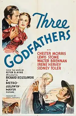 In the autumn of 1935, having written three successful films, Mankiewicz personally requested Mayer to direct his own feature film. Mayer declined his proposition and instead replied: "You have to learn to crawl before you can walk."[27] Mankiewicz was instead promoted as a film producer, beginning with Three Godfathers (1936). Adapted from the 1913 short story by Peter B. Kyne, the film is a biblically-inspired Western about three outlaws—Chester Morris, Lewis Stone and Walter Brennan—rescuing a baby in the Mojave Desert.[28]