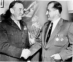 He later falsely claimed participation in 32 aerial missions so as to qualify for a Distinguished Flying Cross and multiple awards of the Air Medal, which the Marine Corps decided to approve in 1952 under his political influence.[40][41] McCarthy also publicly claimed a letter of commendation from his commanding officer and Admiral Chester W. Nimitz, Chief of Naval Operations.[42][43] However, his commander revealed that McCarthy had written this letter himself, probably while preparing award citations and commendation letters for his men, and that he had signed his commander's name, after which Nimitz signed it routinely.[44][43] A "war wound"—a badly broken leg—that McCarthy attributed to varying adventures involving airplane crashes or anti-aircraft fire, had in fact happened aboard ship during a raucous celebration for sailors crossing the equator for the first time.[45][46][47] Because of McCarthy's various lies about his military heroism, his "Tail-Gunner Joe" nickname was used in mockery by his critics.[6][7][8]