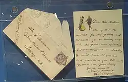Treves observed that Merrick was very sensitive and showed his emotions easily.[71] At times, Merrick was bored and lonely, and demonstrated signs of depression.[72] He had spent his entire adult life segregated from women, first in the workhouse and then as an exhibit. The women he met were either disgusted or frightened by his appearance.[73] His opinions about women were derived from his memories of his mother and what he read in books. Treves decided that Merrick would like to be introduced to a woman and it would help him feel normal.[74] The doctor arranged for a friend of his named Mrs. Leila Maturin, "a young and pretty widow", to visit Merrick.[44] She agreed and with fair warning about his appearance, she went to his rooms for an introduction. The meeting was short, as Merrick quickly became overcome with emotion.[74] He later told Treves that Maturin had been the first woman ever to smile at him, and the first to shake his hand.[44] She kept in contact with him and a letter written by Merrick to her, thanking her for the gift of a book and a brace of grouse, is the only surviving letter written by Merrick.[75] This first experience of meeting a woman, though brief, instilled in Merrick a new sense of self-confidence.[76] He met other women during his life at the hospital, and appeared taken with them all. Treves believed that Merrick's hope was to one day live at an institution for the blind, where he might meet a woman who could not see his deformities.[76]
