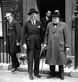 Kennedy rejected the belief of Winston Churchill that any compromise with Nazi Germany was impossible. Instead, he supported Prime Minister Neville Chamberlain's policy of appeasement. Throughout 1938, while the Nazi persecution of the Jews in Germany intensified, Kennedy attempted to arrange a meeting with Adolf Hitler.[80] Shortly before the Nazi bombing of British cities began in September 1940, Kennedy once again sought a personal meeting with Hitler without the approval of the U. S. Department of State, in order to "bring about a better understanding between the United States and Germany".[81]