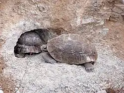 Herpetiles are very plentiful in the park; among the many snakes are several species of rattlesnake (Crotalus sp.), kingsnake (Lampropeltis sp.), coastal rosy boa (Lichanura orcutti), ground snakes and shovelnose snakes (Sonora sp.), desert nightsnakes (Hypsigiena sp.) and racers and coachwhips (Masticophis sp.), among others. Other species most active at night include banded geckos (Coleonyx sp).[52] The desert tortoise, a threatened reptile species that inhabits the creosote (Larrea tridentata)-studded lowlands of the Mojave Desert, is well-adapted to arid conditions; instead of drinking water directly, most of the tortoise's water is obtained from consuming the creosote bush as well as prickly pear (Opuntia sp.) pads and fruits, amongst other desert plants.[53] The creosote is not only a favorite food for the desert tortoise, but is also one of the primary plants eaten by the chuckwalla, a large, diurnal lizard species. Amphibians, though few, are still present near water sources; the California tree frog (Pseudacris cadaverina) is found in greener, lush areas adjacent to permanent water sources (often created by the Pinto Fault), such as along the northern edge of the park, as well as near natural seeps and rocky areas that collect pooled water.[54] The red-spotted toad (Bufo punctatus) is a true denizen of the desert, as it spends most of its life buried underground in a state of torpor, awaiting seasonal rains to emerge and breed en masse.[54]