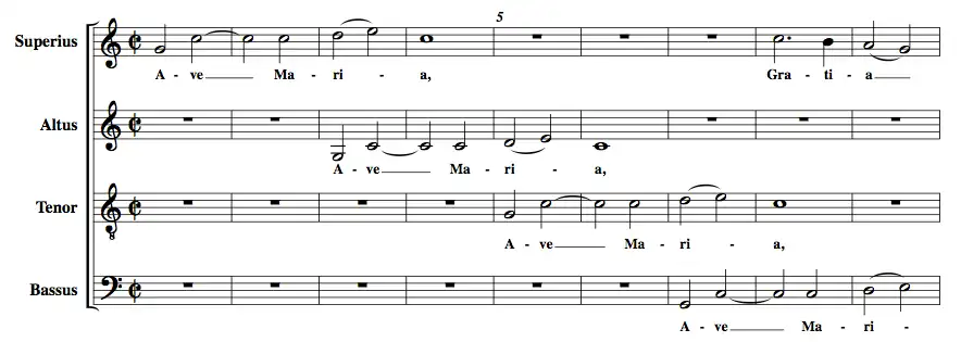 Josquin's four-voice motet Domine, ne in furore was written c. 1480.[103] It includes one voice presenting a short motive, which is subsequently imitated by other voices.