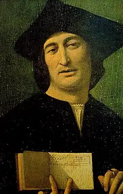 Josquin went to Rome with Ascanio in July 1484 for a year, and may have gone to Paris for a litigation suit involving the benefice in Saint Aubin during the later 1480s.[37] Around this time the poet Serafino dell'Aquila wrote his sonnet to Josquin, "Ad Jusquino suo compagno musico d'Ascanio" ("To Josquin, his fellow musician of Ascanio"), which asks him "not to be discouraged if his 'genius so sublime' seemed poorly remunerated".[37][49][n 7] Between 1485 and 1489 Josquin may have served under the Hungarian king Matthias Corvinus in Vienna;[50] an account by the Cardinal Girolamo Aleandro in 1539 recalls the archbishop of Esztergom Pal Varday stating that the court of Matthias included "excellent painters and musicians, among them even Josquin himself".[51][52] Some scholars suggest Aleandro was repeating a false rumor,[37] or that Varday confused Josquin des Prez for Josquin Dor or Johannes de Stokem.[53] Fallows contends that it is unlikely that Varday, who was well-educated and a musician, would have made such a mistake, but concedes that it is possible.[54] The court of Matthias had a high standard of music and employed numerous musicians, many of them from Italy.[37] Though Fallows asserts that Josquin's presence in the Hungarian king's service is likely,[55] the evidence is circumstantial, and no original documents survive to confirm the claim.[37] Josquin was in Milan again in January 1489, probably until early May, and met the theorist and composer Franchinus Gaffurius there.[56]
