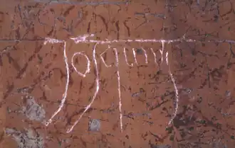 After restorations from 1997 to 1998, the name JOSQUINJ was found as a graffito on the wall of the Sistine Chapel's cantoria (choir gallery).[57][62] It is one of almost four hundred names inscribed in the chapel, around a hundred of which can be identified with singers of the papal choir.[63] They date from the 15th to 18th centuries, and the JOSQUINJ signature is in the style of the former.[64] There is some evidence suggesting the name refers to Josquin des Prez; it may be interpreted as either "Josquin" or "Josquinus", depending on whether the curved line on the far right is read as the abbreviation for "us".[63] Other choristers named Josquin tended to sign their name in full, whereas Josquin des Prez is known to have done so mononymously on occasion.[63] Andrea Adami da Bolsena notes in his 1711 Osservazioni per ben regolare il coro dei cantori della Cappella Pontificia that in his time Josquin's name was visibly 'sculpted' in the Sistine Chapel's choir room.[64] The musicologist Richard Sherr writes that "while this is not a true autograph signature, the possibility that Josquin des Prez actually produced it during his stay in the papal chapel is very high",[64] and Fallows says that "it hardly counts as an autograph, but it may be the closest we can get."[65]