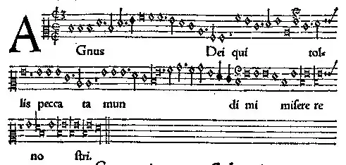 Josquin's two canonic masses were published in Petrucci's third book of Josquin masses in 1514; the Missa ad fugam is the earlier of the two. It has a head-motif consisting of the whole first Kyrie which is repeated in the beginning of all five movements.[120] The canon is restricted to the highest voice, and the pitch interval between the voices is fixed while the temporal interval varies between only two values; the two free voices generally do not participate in the imitation.[121] The precise relationship of Josquin's mass to de Orto's is uncertain, as is Josquin's authorship of the mass.[122][123]