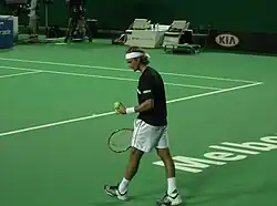 At the Washington Open, Ferrero advanced to the third round, beating Tommy Robredo before a loss to Tommy Haas.[28] Ferrero qualified to play the Canada Masters. He defeated Lleyton Hewitt in the first round in straight sets, ending Hewitt's three–match winning streak against him. He then defeated 13th seed Gaël Monfils, before losing once again to Andy Murray.[29] Ferrero lost in the first round of the Cincinnati Masters to Marin Čilić. He began his campaign at the US Open by defeating Fabrice Santoro in what would be Santoro's last US Open match. In the second round, Ferrero mounted a remarkable comeback from two sets down for the third time in his career to defeat Philipp Petzschner in five sets. Ferrero lost in the fourth round to eventual champion Juan Martín del Potro in straight sets. With this result Ferrero managed to re-enter the top 20, having been ranked No. 115 just five months earlier.