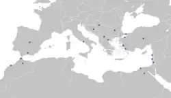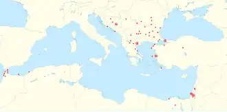 ![]() Historical Judeo-Spanish speech communities in the Mediterranean. Ringed circles represent modern speech communities. | |