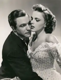 In her next film, For Me and My Gal (1942), Garland performed with Gene Kelly in his first screen appearance. She was given the "glamor treatment" in Presenting Lily Mars (1943), in which she was dressed in "grown-up" gowns. Her lightened hair was also pulled up in a stylish fashion. However, no matter how glamorous or beautiful she appeared on screen or in photographs, she was never confident about her appearance and never escaped the "girl-next-door" image that the studio had created for her.[57] She had a second abortion in that same year when she became pregnant during an affair with actor Tyrone Power.[58]