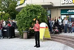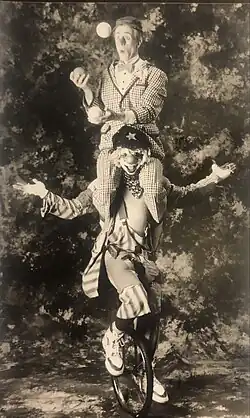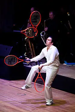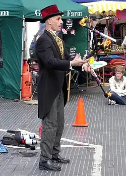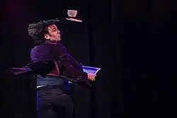Gentleman juggling was popular in variety theatres and usually involves juggling some of the elements of a gentleman's attire, namely hats, canes, gloves, cigars, and other everyday items[24] such as plates and wine bottles.[25] The style is often sophisticated and visual rather than comedic, though it has been interpreted in many different styles. French juggler Gaston Palmer, for example, gained a kind of notoriety for his comedic execution of gentleman juggling tricks.[26]