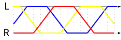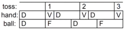 An illustration of Shannon's juggling theorem for the cascade juggling pattern, note that the hand making the toss reverses each time through the pattern (1st time: RLR, 2nd time: LRL), meaning the tosses alternate between hands