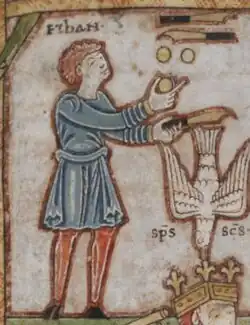 Circa 1075–1250 A.D. Juggler in the Tiberius Psalter, with balls and knives.
