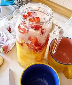Juice is a drink made from the extraction or pressing of the natural liquid contained in fruit and vegetables. It can also refer to liquids that are flavored with concentrate or other biological food sources like meat or seafood, such as clam juice. Juice is commonly consumed as a beverage or used as an ingredient or flavoring in foods or other beverages, such as smoothies. Juice emerged as a popular beverage choice after the development of pasteurization methods enabled its preservation without using fermentation (which is used in wine production).[1] The largest fruit juice consumers are New Zealand (nearly a cup, or 8 ounces, each day) and Colombia (more than three quarters of a cup each day). Fruit juice consumption on average increases with a country's income level.[2]