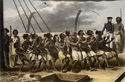 Māori men and women on board Astrolabe performing a dance, with a French officer at right.