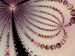 Collection of Julia sets laid out in a 100 × 100 grid such that the center of each image corresponds to the same position in the complex plane as the value of the set. When laid out like this, the overall image resembles a Photographic mosaic depicting a Mandelbrot set.