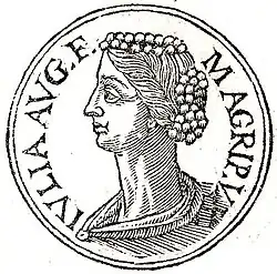 - ^ According to Suetonius, Caligula – the son of Julia's daughter Agrippina and Tiberius's nephew Germanicus – would claim after his own ascension that his mother Agrippina was the product of an incestuous union between Julia and Augustus. The reason for this is allegedly because he did not wish to be thought of as the grandson of Agrippa due to his humble origins.[18] However, the existence of coins and inscriptions dating from Caligula's reign that clearly identify Agrippina as Agrippa's daughter suggests this account is apocryphal.[19] Barrett considered it to be a joke made in poor taste, rather than outright dismiss it as false.[20]