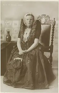 Juliana was born on 30 April 1909 at Noordeinde Palace in The Hague, the only child of the reigning Dutch monarch, Queen Wilhelmina. Her father was Duke Henry of Mecklenburg-Schwerin.[1] She was the first Dutch royal baby since Wilhelmina herself was born in 1880. Wilhelmina had suffered two miscarriages and had given birth to a premature and stillborn son, raising the prospect of a succession crisis.
