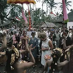 Although the bicycle and the down-to-earth manners suggest a simple life style, the Dutch royal court of the 1950s and 1960s was still an opulent affair with chamberlains in magnificent uniforms, gilded state coaches, visits to towns in open carriages and lavish entertaining in the huge palaces. At the same time the queen began visiting the citizens of the nearby towns and, unannounced, would drop in on social institutions and schools like her mother before her insisting on seeing reality rather than a prepared show. On the international stage, Queen Juliana was interested in the problems of developing countries, the refugee problem, and particularly child welfare in developing countries. Together with her daughters Beatrix and Irene, she took part in the ship tour organized by Queen Frederica and her husband King Paul of Greece in 1954, which became known as the “Cruise of the Kings” and was attended by over 100 royals from all over Europe. Francis of Bavaria, a participant, reports in his memoirs the anecdote that the queens of Greece, the Netherlands and Italy went ashore in a harbor in the middle of a crowd of nephews and nieces, and a waiting journalist called out to them: "What is the purpose of this trip?", whereupon Queen Juliana replied with a friendly smile: "Oh, you know, this is our union’s company outing."[7]