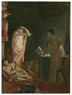 Brutus then attacks Cassius for supposedly soiling the noble act of regicide by having accepted bribes. ("Did not great Julius bleed for justice' sake? / What villain touched his body, that did stab, / And not for justice?"[3]) The two are reconciled, especially after Brutus reveals that his beloved wife committed suicide under the stress of his absence from Rome; they prepare for a civil war against Antony, Caesar's adopted son Octavius, and Lepidus who have formed a triumvirate in Rome. That night, Caesar's ghost appears to Brutus with a warning of defeat. (He informs Brutus, "Thou shalt see me at Philippi."[4])