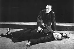 - 1937: Caesar, Orson Welles's famous Mercury Theatre production, drew fevered comment as the director dressed his protagonists in uniforms reminiscent of those common at the time in Fascist Italy and Nazi Germany, drawing a specific analogy between Caesar and Fascist Italian leader Benito Mussolini. Time magazine gave the production a rave review,[25] together with the New York critics.[26]: 313–319 The fulcrum of the show was the slaughter of Cinna the Poet (Norman Lloyd), a scene that stopped the show.[27] Caesar opened at the Mercury Theatre in New York City in November 1937[28]: 339 and moved to the larger National Theater in January 1938,[28]: 341 running a total of 157 performances.[29] A second company made a five-month national tour with Caesar in 1938, again to critical acclaim.[30]: 357